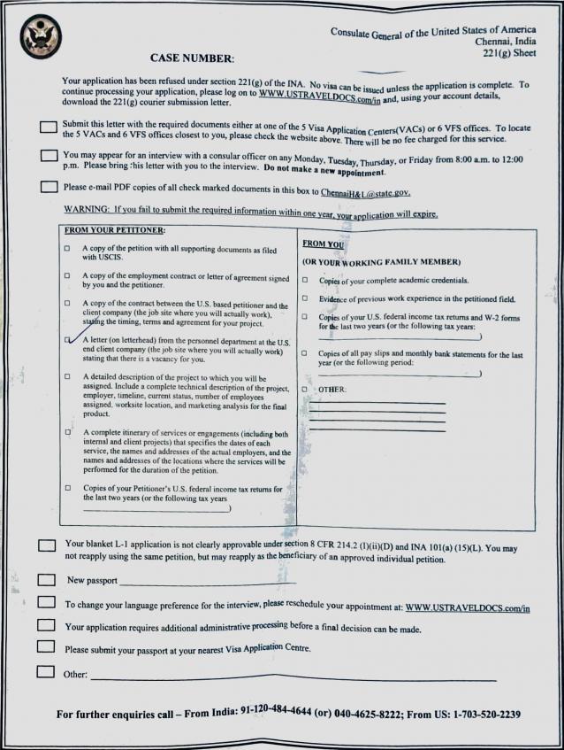 221(g) Refusal Green Form at the U.S. Consulate in Chennai, India