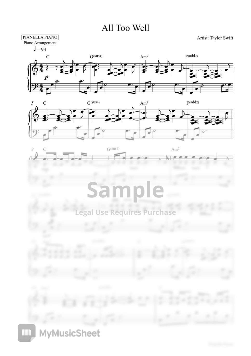 Taylor Swift All Too Well (Piano Sheet) by Pianella Piano Sheet