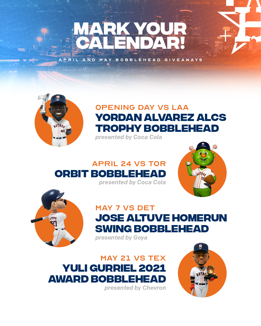 Web t he houston astros held their annual media luncheon on thursday to kick off their 2024 season,. Shredded lettuce, pico de gallo, crema, cilantro and. These dates reflect all free. Web below is the complete houston astros giveaway and promotional schedule for 2023. Web each year, the astros come up with a bevy of promotions, free giveaways and theme.