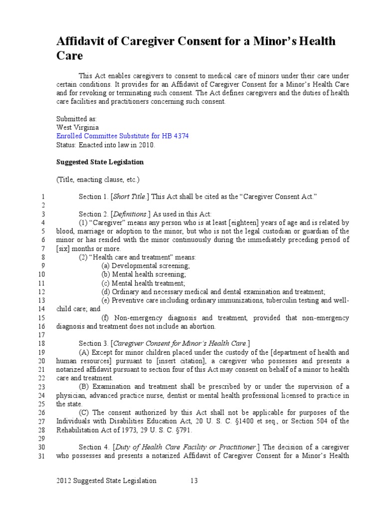 Affidavit of Caregiver Consent for a Minor’s Health Care 2012 SSL