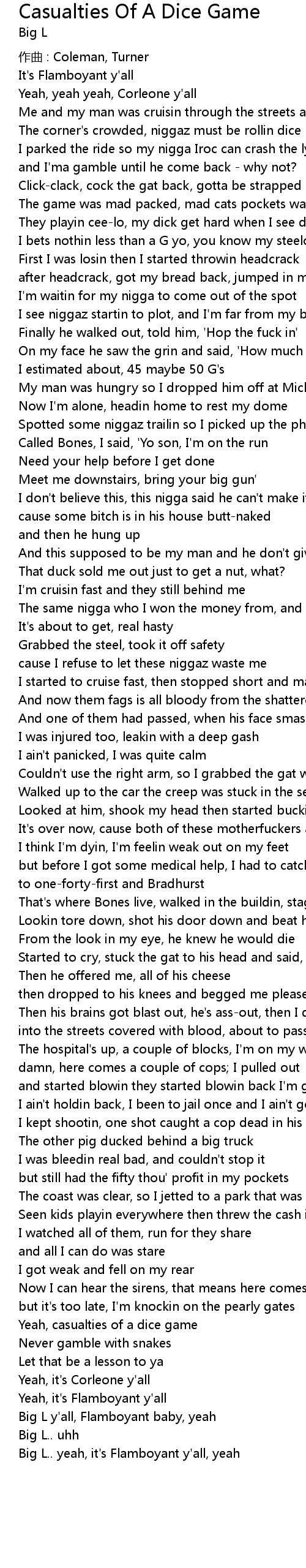 [big l] it's flamboyant y'all yeah, yeah yeah, corleone y'all me and my man was cruisin. Web song lyrics for casualties of a dice game by big l. Web listen to casualties of a dice game on spotify. Web the lyrics for casualties of a dice game by big l have been translated into 1 languages. Big l · song.