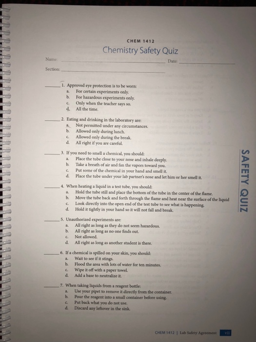 Solved CHEM 1412 Chemistry Safety Quiz Name Date Section...
