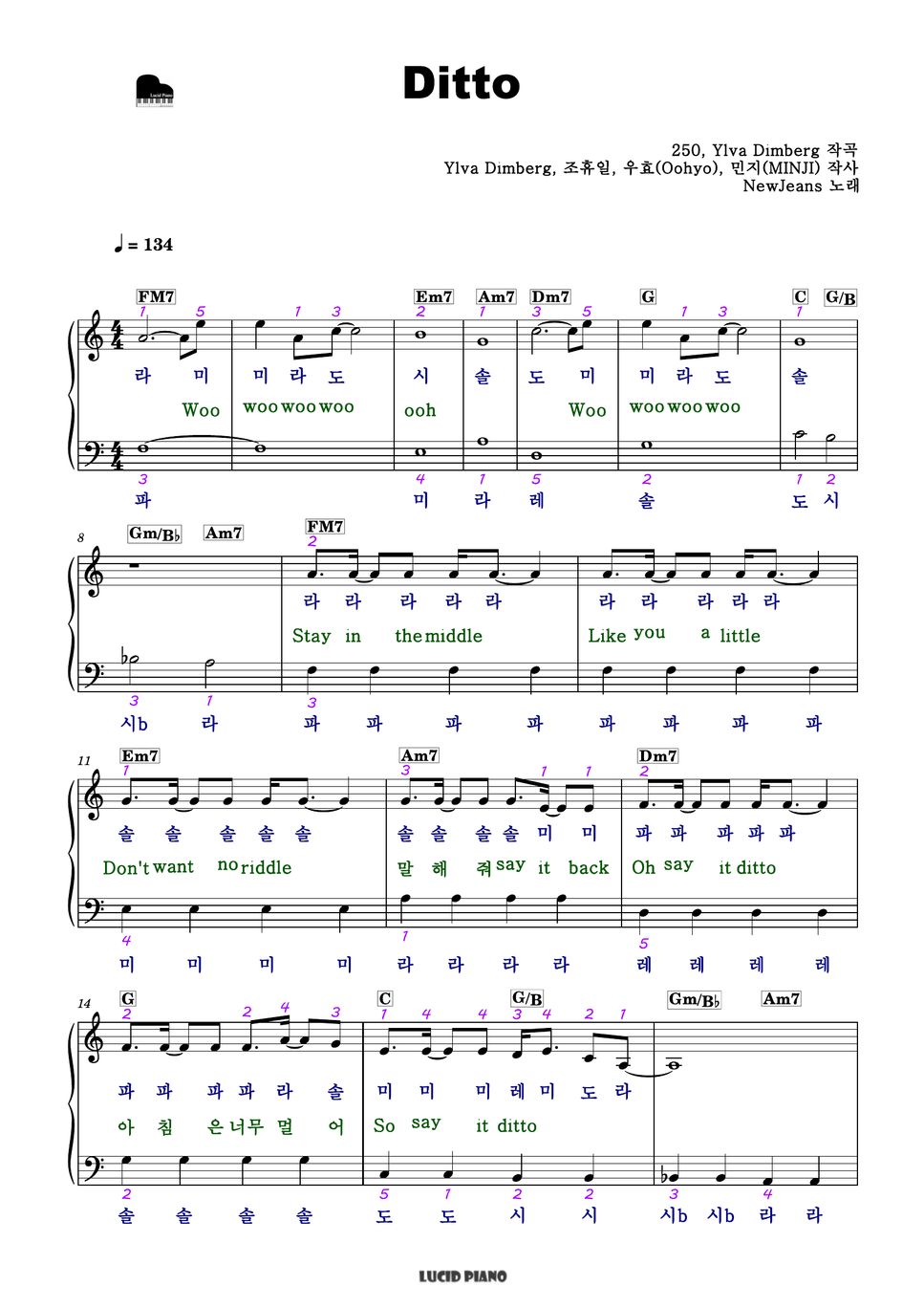NewJeans (뉴진스) Ditto (계이름 악보, 조표 없는 쉬운 다장조) 楽譜 by Lucid Piano