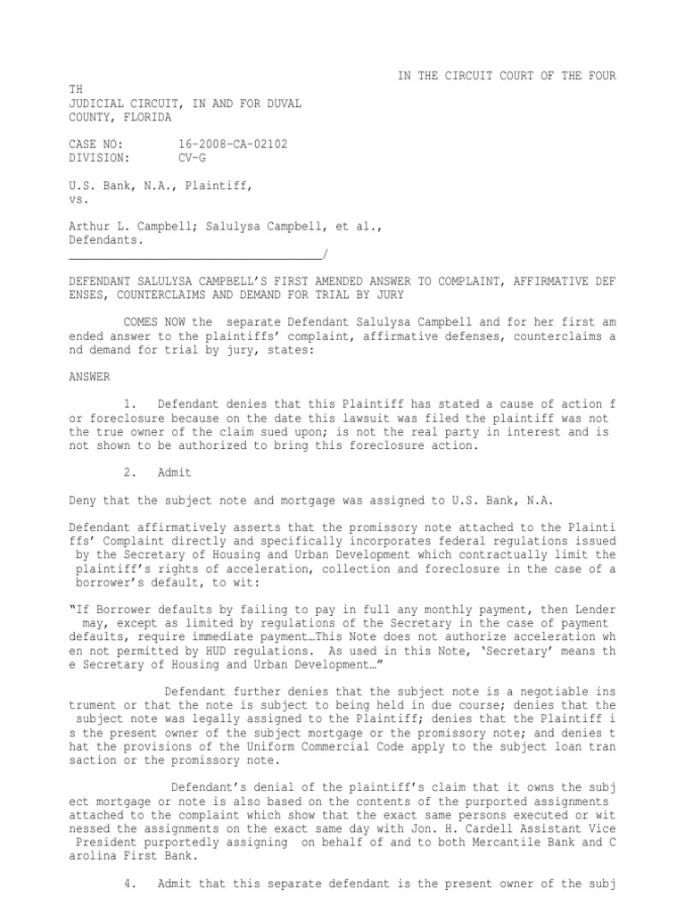 Foreclosure Answer With Affirmative Defenses, Jury Trial