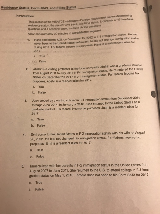 Solved Residency Status, Form 8843, and Filing Status This