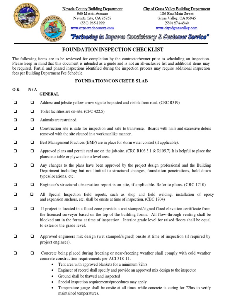 Yes no anchor bolts per irc r403.1.6.1: Web look for water damage. Permits and plans job address shall be posted in a visible location. Bowing foundation walls failing equipment (sump pump or dehumidifier) water leaks, high humidity, or water damage; Web july 1, 2016 this inspection checklist reflects code requirements of the 2015 international residential code (irc) and aci 318 w/ washington state amendments. (r404.1.6) foundations in flood prone areas per table r301.2.4, (by local jurisdiction) shall be designed per r322, and elevation determined per fema maps. Web the topics for discussion were established at the onset of the meetings with the general intent to establish a set of guidelines and procedures for the inspection of foundation construction and foundation repairs incorporated into an easy to use inspection document. You can change this form’s content without programming skills. On average, a foundation inspection will cost around. If you smell a musty odor in the basement corners or crawl spaces, it can signal foundation damage.
