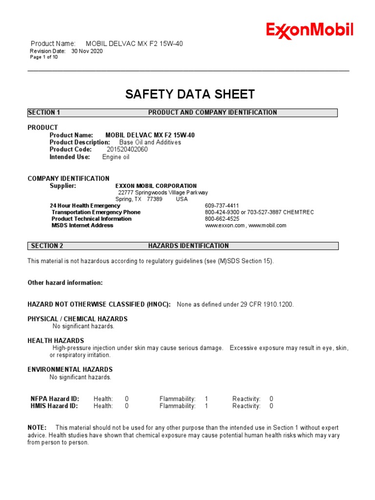 Safety Data Sheet Product Name MOBIL DELVAC MX F2 15W40 PDF