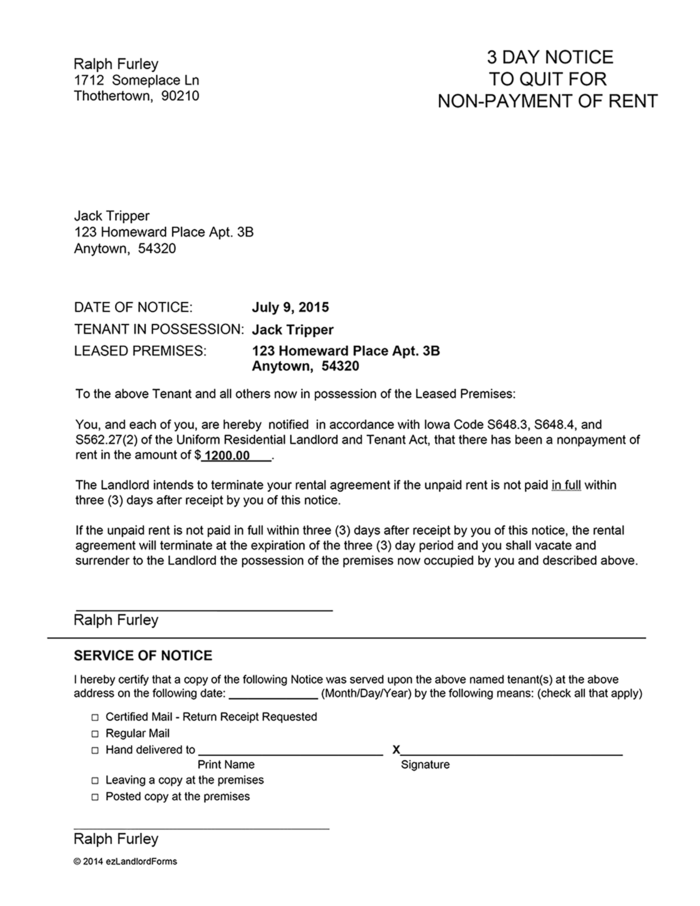 Under iowa law, the landlord has the right to terminate a rental agreement and demand possession of the premises within 3 days if the tenant has. This form can be sent to a tenant immediately following the day rent was due. The tenant has the option to pay the rent balance due or vacate the premises within three (3) calendar.