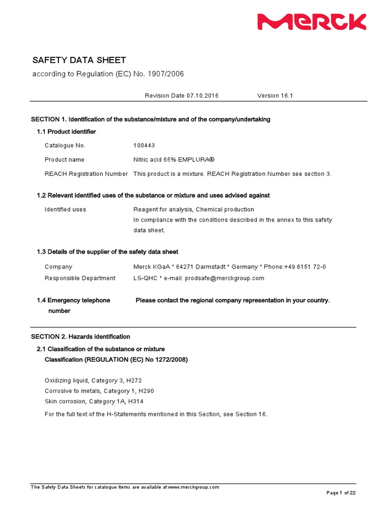 Nitric Acid Sds Sheet - Nitric acid product number : Aldrich 1.2 relevant identified uses of the substance or mixture and uses.