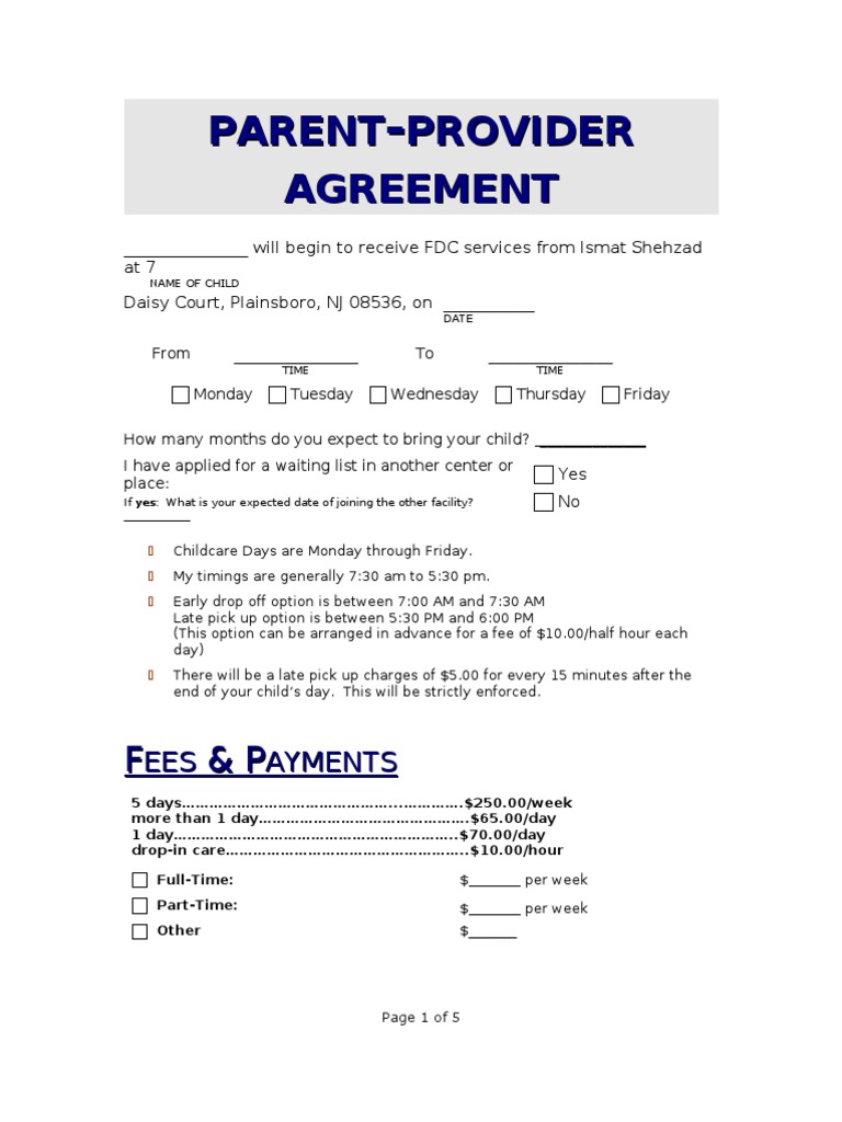 Parent Provider Agreement PDF Day Care Child Care