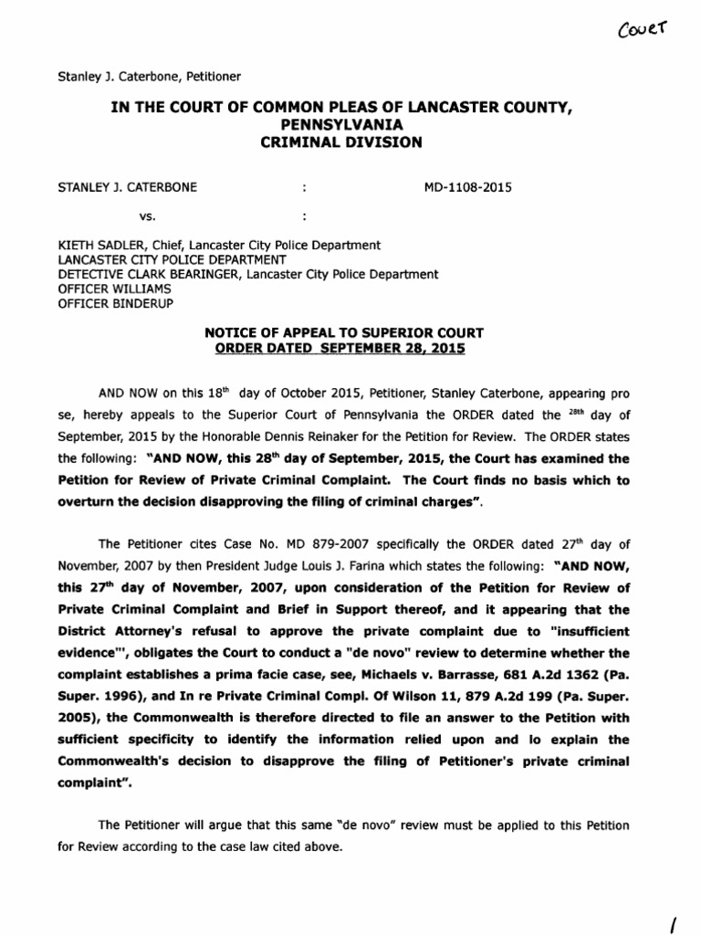 Private Criminal Complaint Petition for Review APPEAL to Superior Court