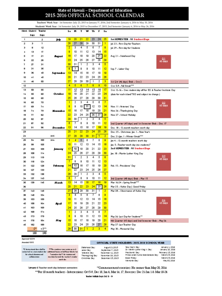 20152016 Official School Calendar State of Hawaii Department of