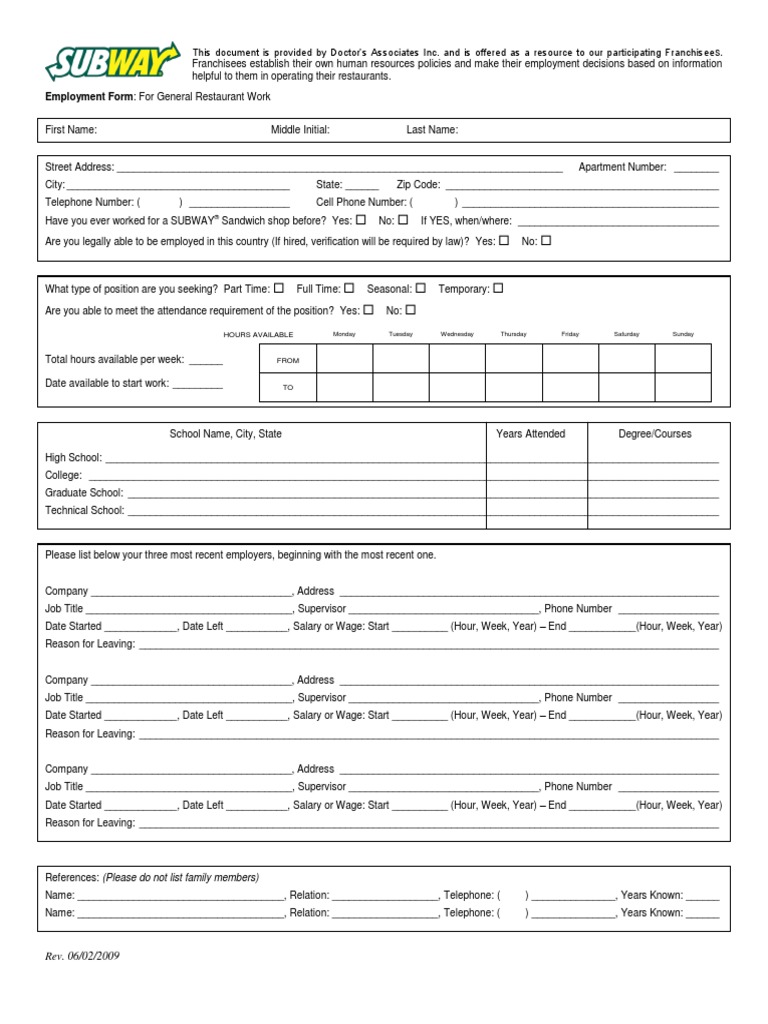 Subway Employment Application Form Free Download