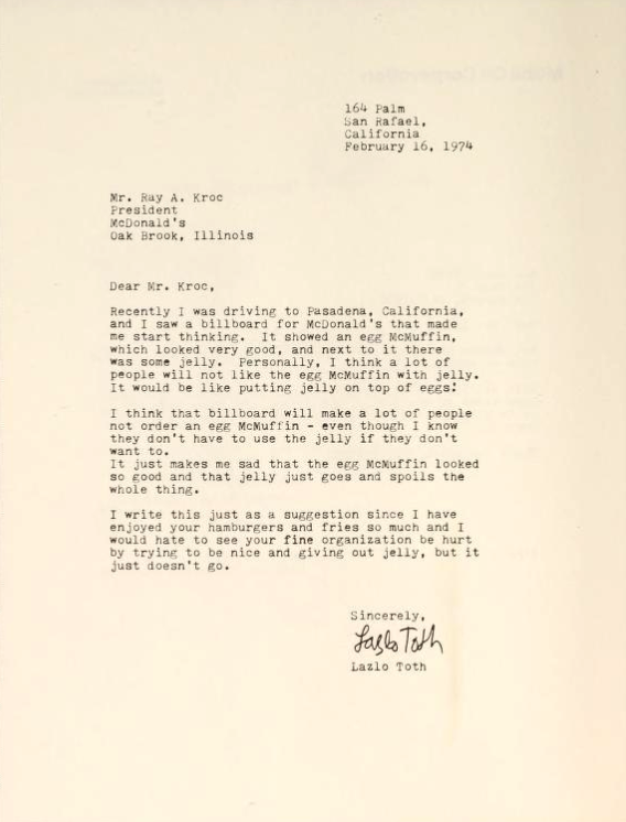 Letters of Note on Twitter "When Lazlo Toth wrote to McDonalds about