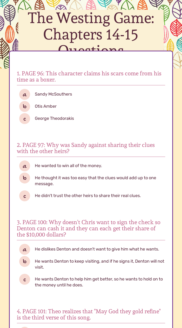 The Westing Game Chapters 1415 Questions Interactive Worksheet by