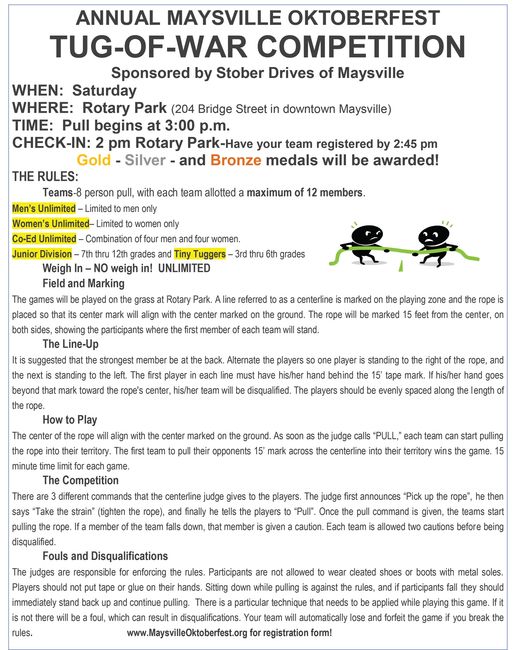 Print tug of war tournament brackets. Companies can enter 1 team. All participants must sign the waiver in order to participate. 50% of the participants of each team must be registered to a relay team. Specific roster rules posted on the rules sheet and the event rosters document on the admin toolkit page.