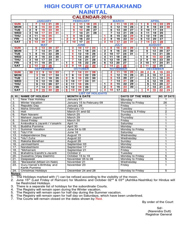 Uttarakhand High Court Calendar, 2018 Observances Holidays