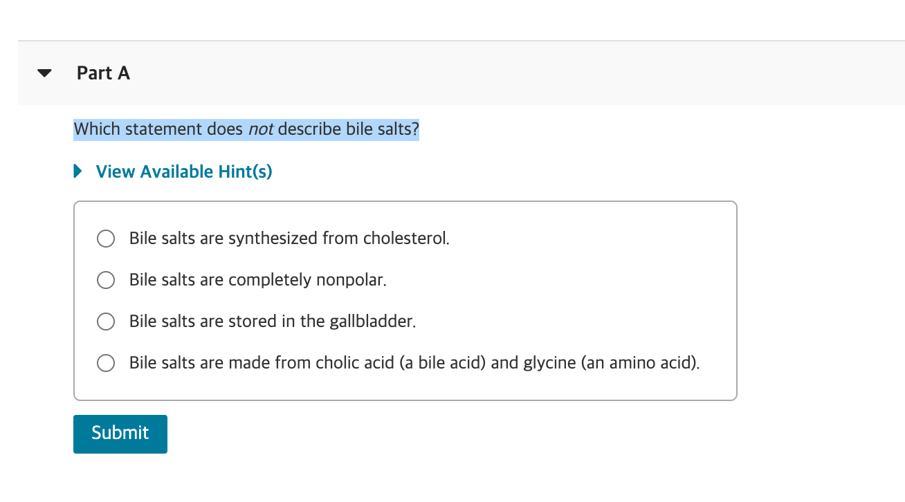 Solved Part A Which statement does not describe bile salts?