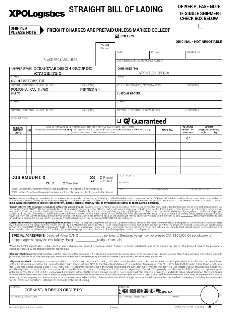 XPO Logistics Cargo Bill Of Lading